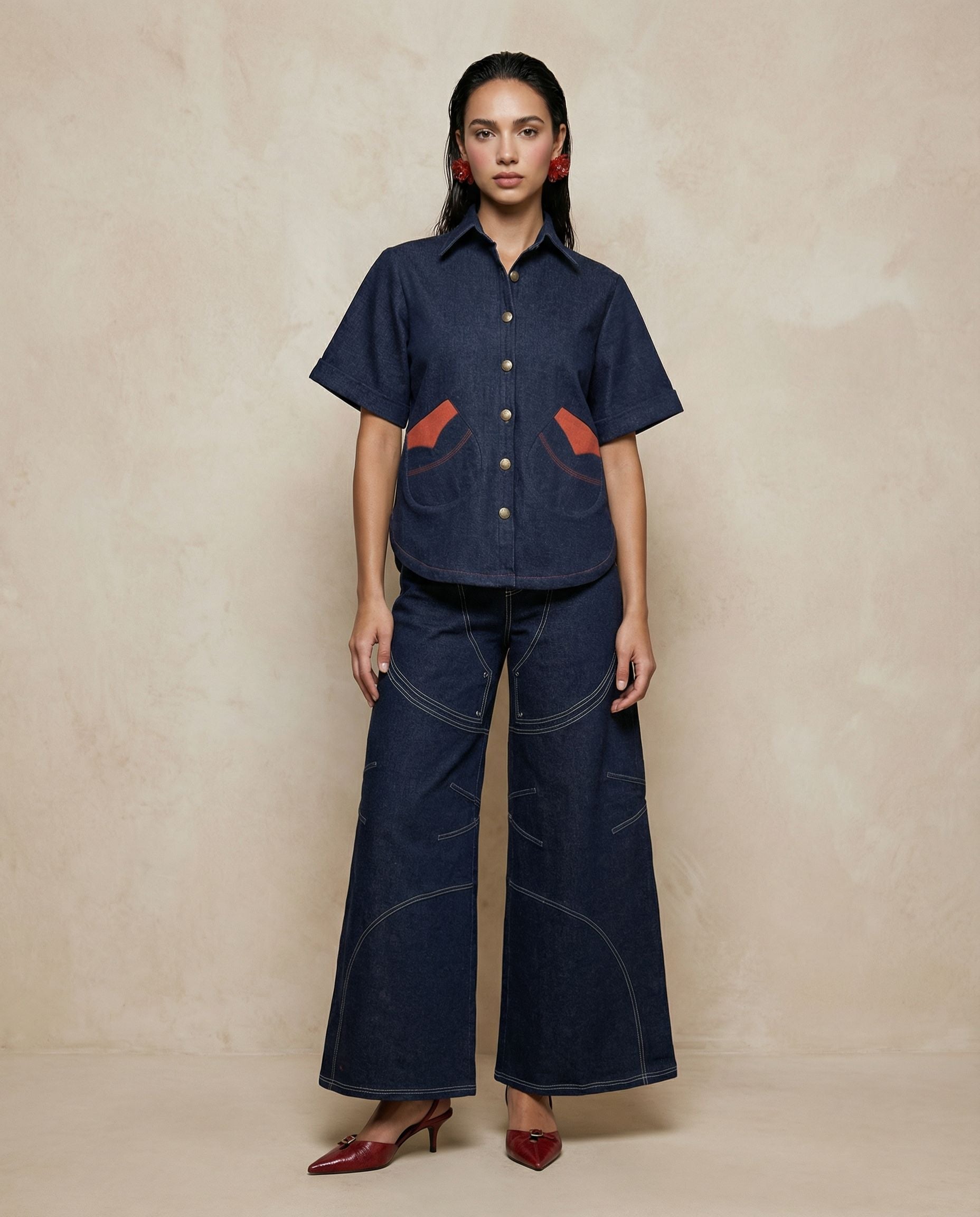 A playful reinterpretation of classic denim shirting, this indigo shirt features a striking heart cutwork panel at the back that reveals a white layer beneath. The structured silhouette is balanced with soft curves, short sleeves, and contrast stitching, while subtle red accents on the pockets echo the motif. Crafted in sturdy denim with signature hardware buttons, the piece blends craftsmanship with a bold sense of individuality.